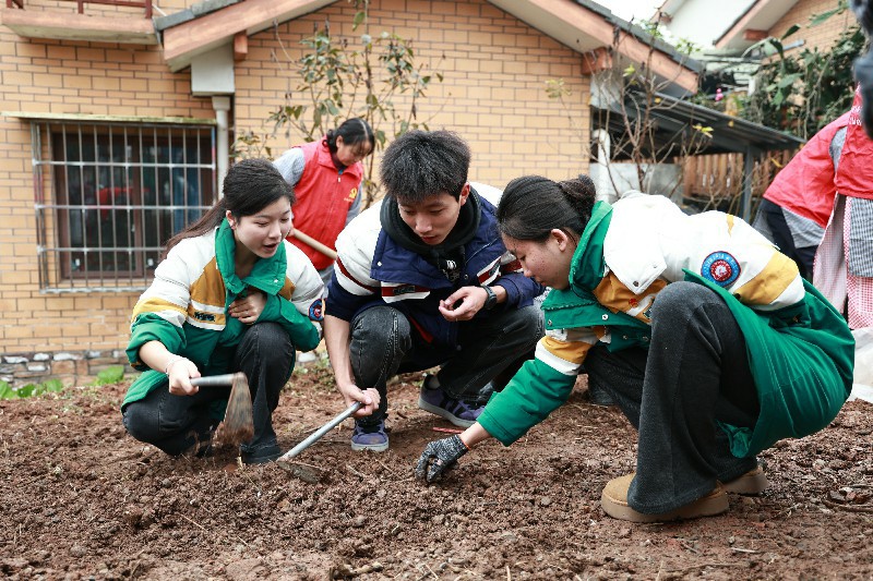 活动当天,在工作人员的引导下,同学们迅速投入到劳动中。大家分工明确、协作有序,在道路两旁开展整地工作。同学们俯身捡拾石块、清理杂物,为即将种植的小花腾出整洁的土地。虽然冬日的空气略带寒意,但现场却是一派热火朝天的景原本略显杂乱的道路边逐渐变得平整有序。待花苗种下后,这里也将成为一道充满生机的乡村风景线。