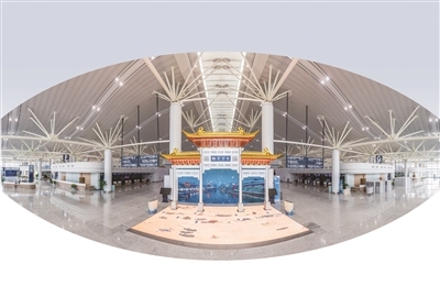 图:T1航站楼一进门就能看到偌大的“天下文枢”牌坊。