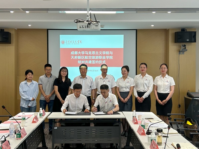 深入贯彻落实习近平新时代中国特色社会主义思想和党的二十大精神,根据《中共四川省委教育工委 四川省教育厅关于开展四川省高校马克思主义学院结对共建行动的通知》(川教工委函〔2024〕16号)文件要求,2024年5月16日下午,我校党委书记、督导专员杨波,党委副书记、纪委书记、监委主任雷莉霞,马克思主义学院副院长李珂,马克思主义学院党总支副书记、教学科科长杜玲,马克思主义学院思政教研室主任倪佳韵,马克思主义学院杜尧凤老师等一行前往成都大学开展两校马克思主义学院结对共建工作。成都大学党委副书记胡秀强(正厅级),马克思主义学院院长屈陆,马克思主义学院副院长樊英杰以及马克思主义学院各教研室主任接待了我校杨波书记一行。两校就结对共建马克思主义学院相关工作进行了座谈并举行结对签约仪式。会议由成都大学马克思主义学院院长屈陆主持。
