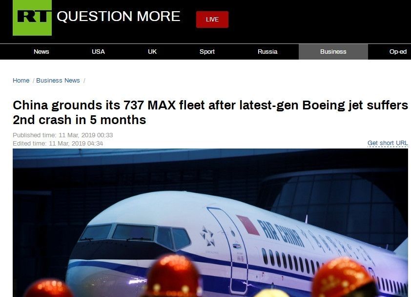 今日俄罗斯报道——5个月来最新一代波音飞机第二次坠毁之后,中国停飞其737 MAX机队